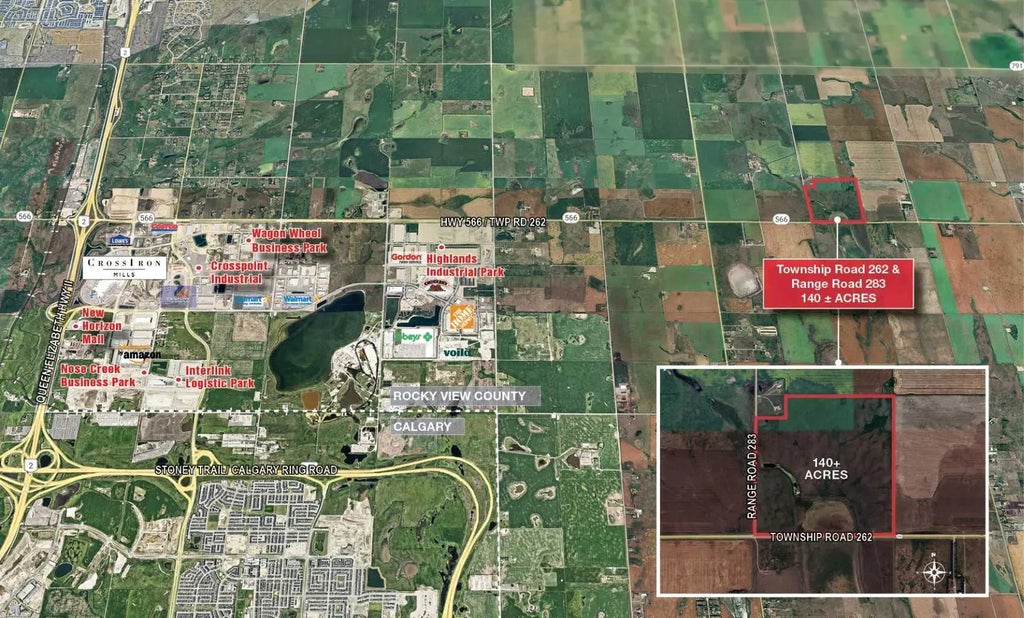 The subject site is located east of Balzac, Rocky View County, AB, in an area that has seen significant growth and development in recent years. About a 20 minute drive from Airdrie, AB and 18 minutes from Calgary, AB. Close proximity to some major commercial developments, including CrossIron Mills shopping centre, various industrial and logistics parks and retail developments, offering future potential for various types of developments if the parcel is rezoned. Quick and easy access to Crossiron Drive, Dwight McClellan/Metis Trail, Stoney Trail (Calgary ring road) and QE 2, as well as the Calgary International Airport.
