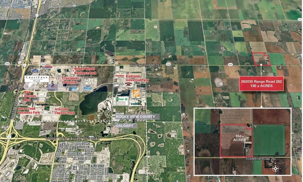 About a 20 minute drive from Airdrie, AB and 18 minutes from Calgary, AB. Close proximity to some major commercial developments, including CrossIron Mills shopping centre, various industrial and logistics parks and retail developments, offering future potential for various types of developments if the parcel is rezoned.